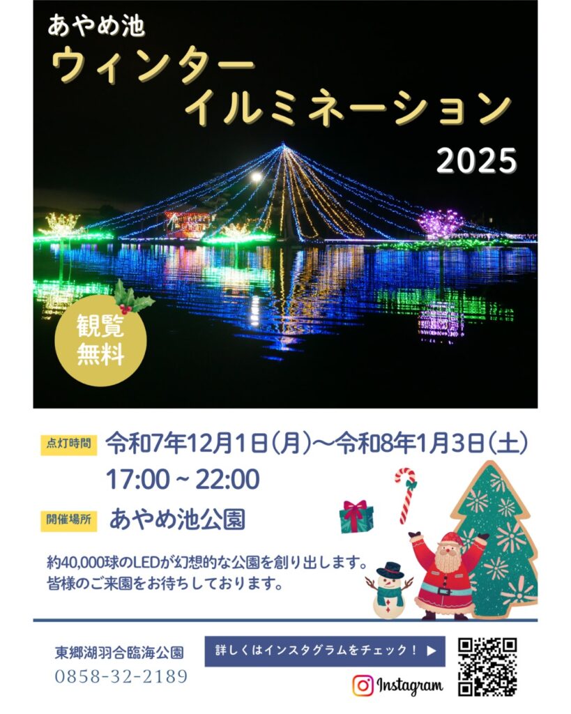東郷池沿いにある四季折々の花が楽しめるあやめ池公園で、今年も「あやめ池ウィンターイルミネーション2025」が開催されます!