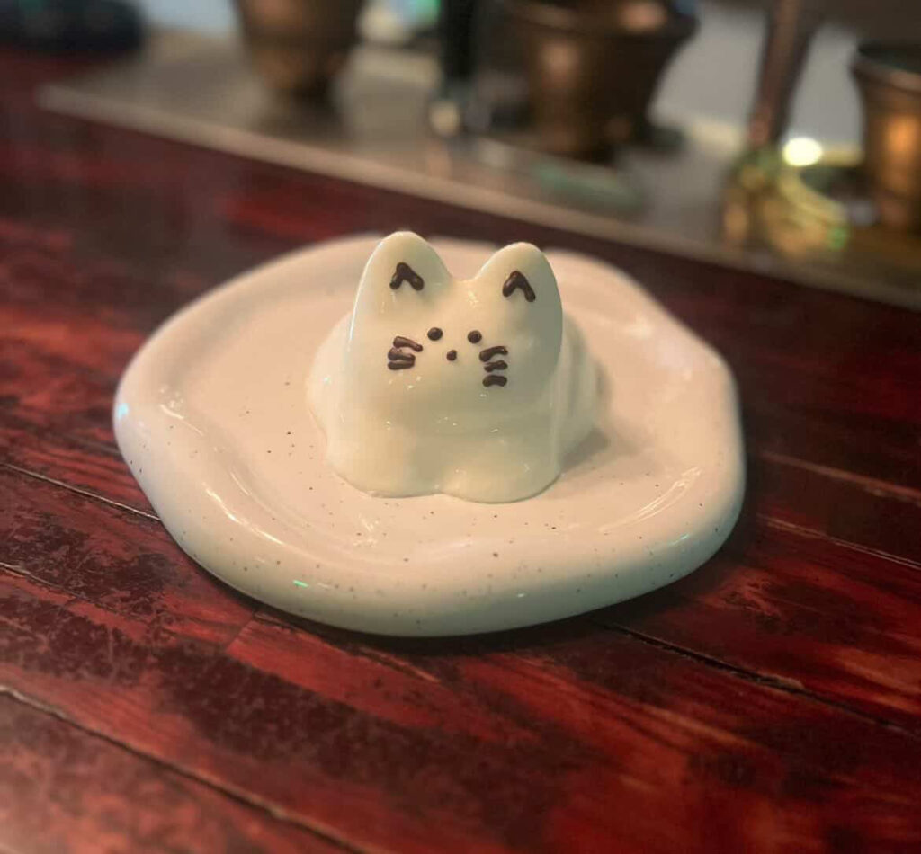 とにかく見た目がとっても可愛い!白くてぷるぷるなねこが、お皿を揺らすとゆらゆら動き、崩すのがもったいないくらい。