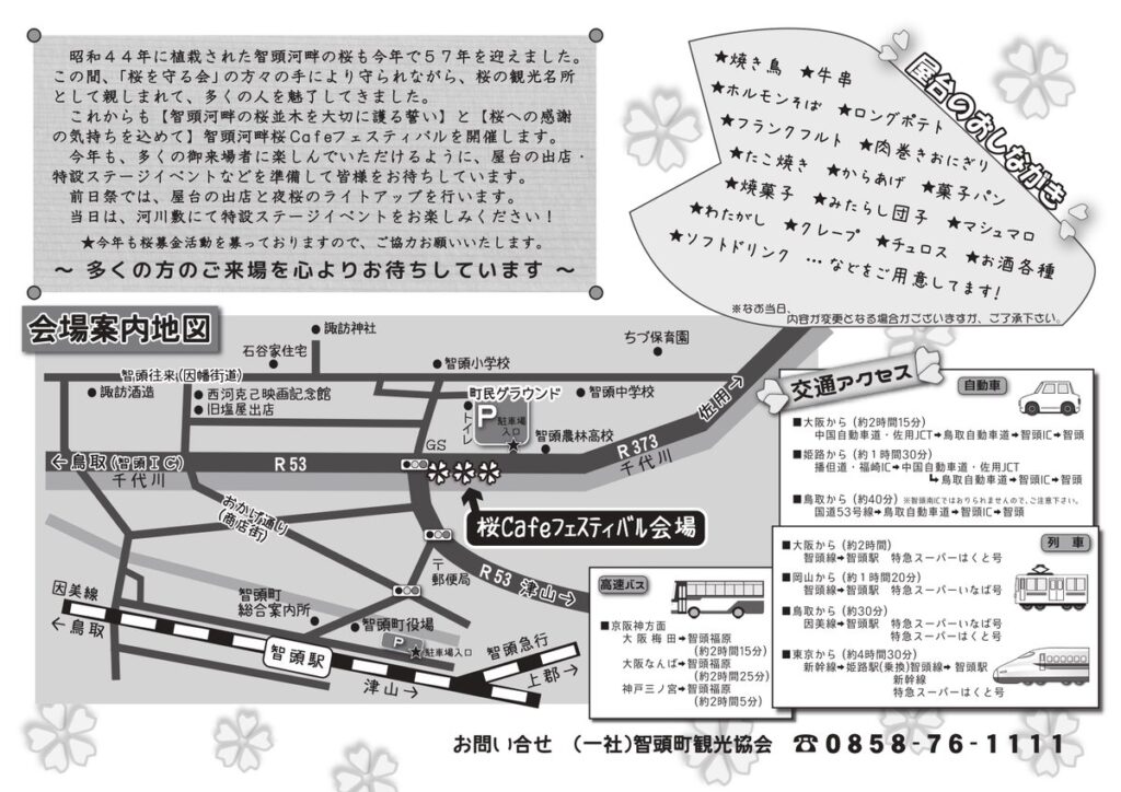 このイベントは、智頭の美しい桜を愛でながら、多彩なステージや地元のグルメ屋台を楽しめる智頭町最大の春祭りです。今年はさらに新しい企画も加わり、例年以上に賑やかな週末になりそうですよ!