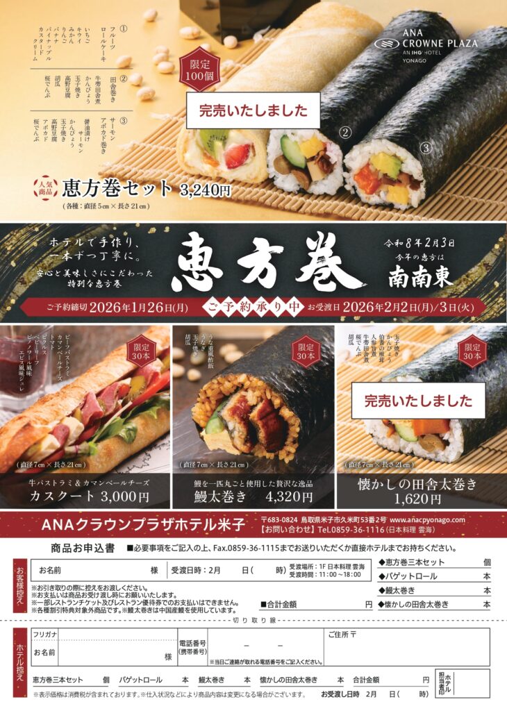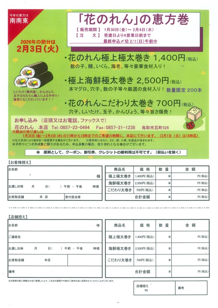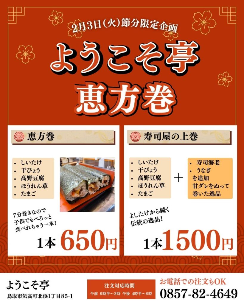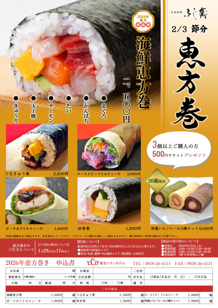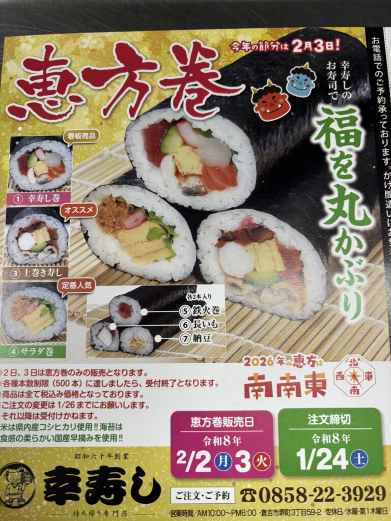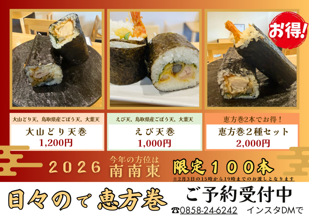鳥取県内の飲食店や宿泊施設等で販売される、恵方巻情報をまとめました。