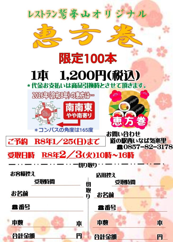 レストラン鷲峰山オリジナル恵方巻が、今年も販売されます。