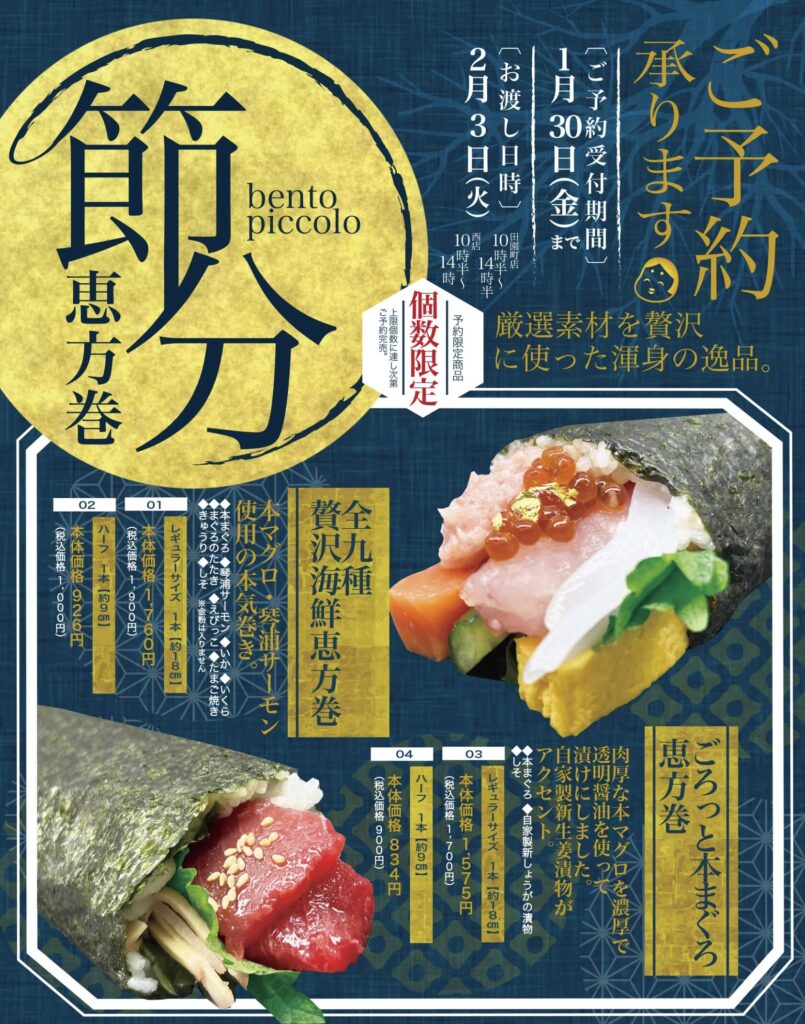 今年のpiccoloの恵方巻は、本マグロと肉厚琴浦サーモンを使用した本気巻き!