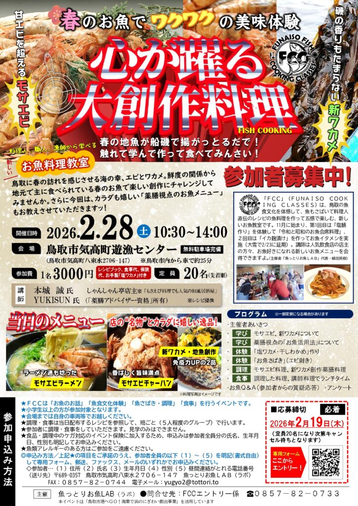 鳥取の魚食文化を“作って・学んで・味わう”体験型イベント「心が踊る大創作料理 FISH COOKING」が2月28日(土)に鳥取市で開催されます!
