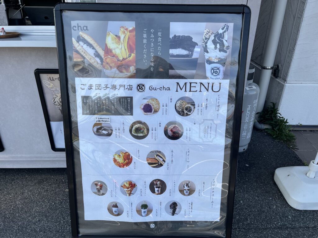 看板メニューのごま団子は、黒ごま、紫芋、抹茶、苺の4種類。