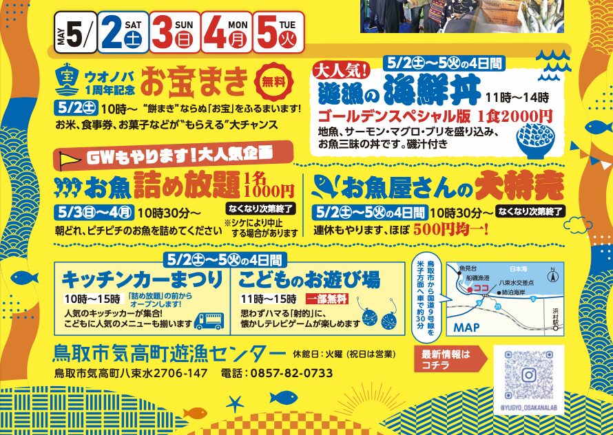 GW後半の予定がまだの方は、ぜひ鳥取の海の恵みと活気を感じに、気高町の遊漁センターへ足を運んでみてはいかがでしょうか。