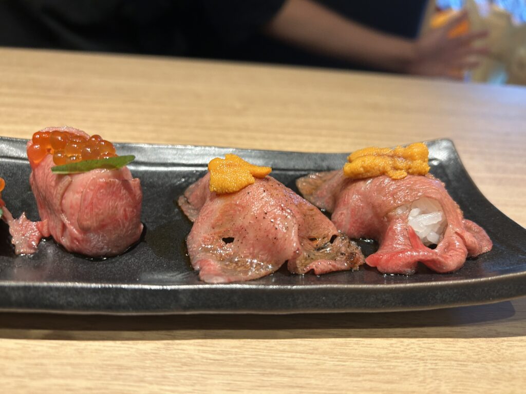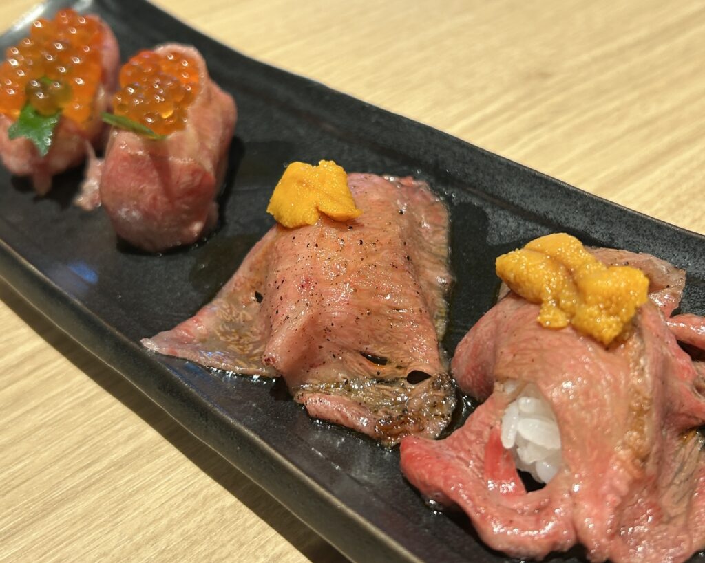 見た目も華やかな炙り肉寿司。うにやいくらを贅沢にのせた軍艦寿司は、海苔の代わりに肉で巻かれています。