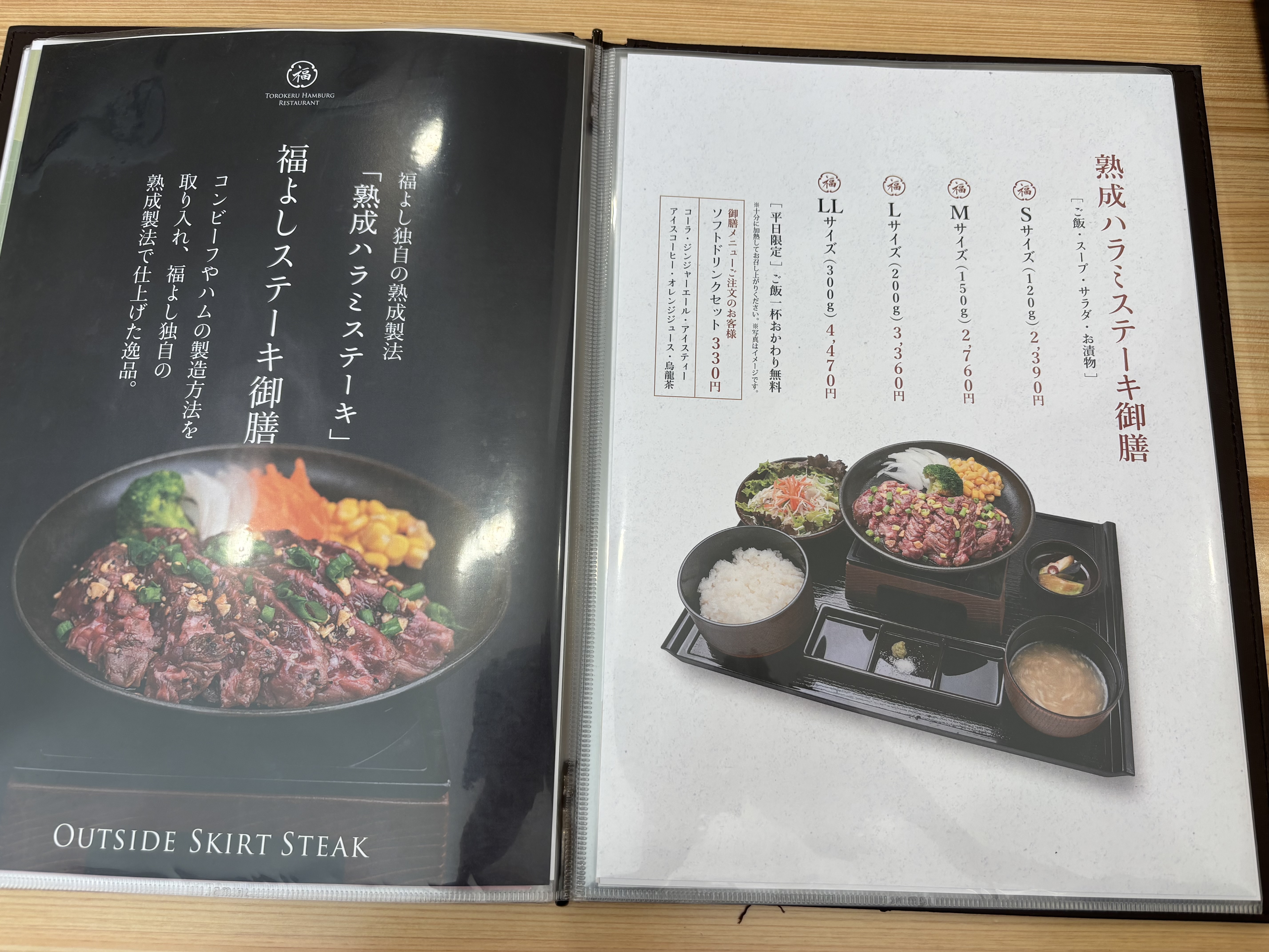 ハンバーグだけではなく、熟成ハラミステーキ御膳もあります。