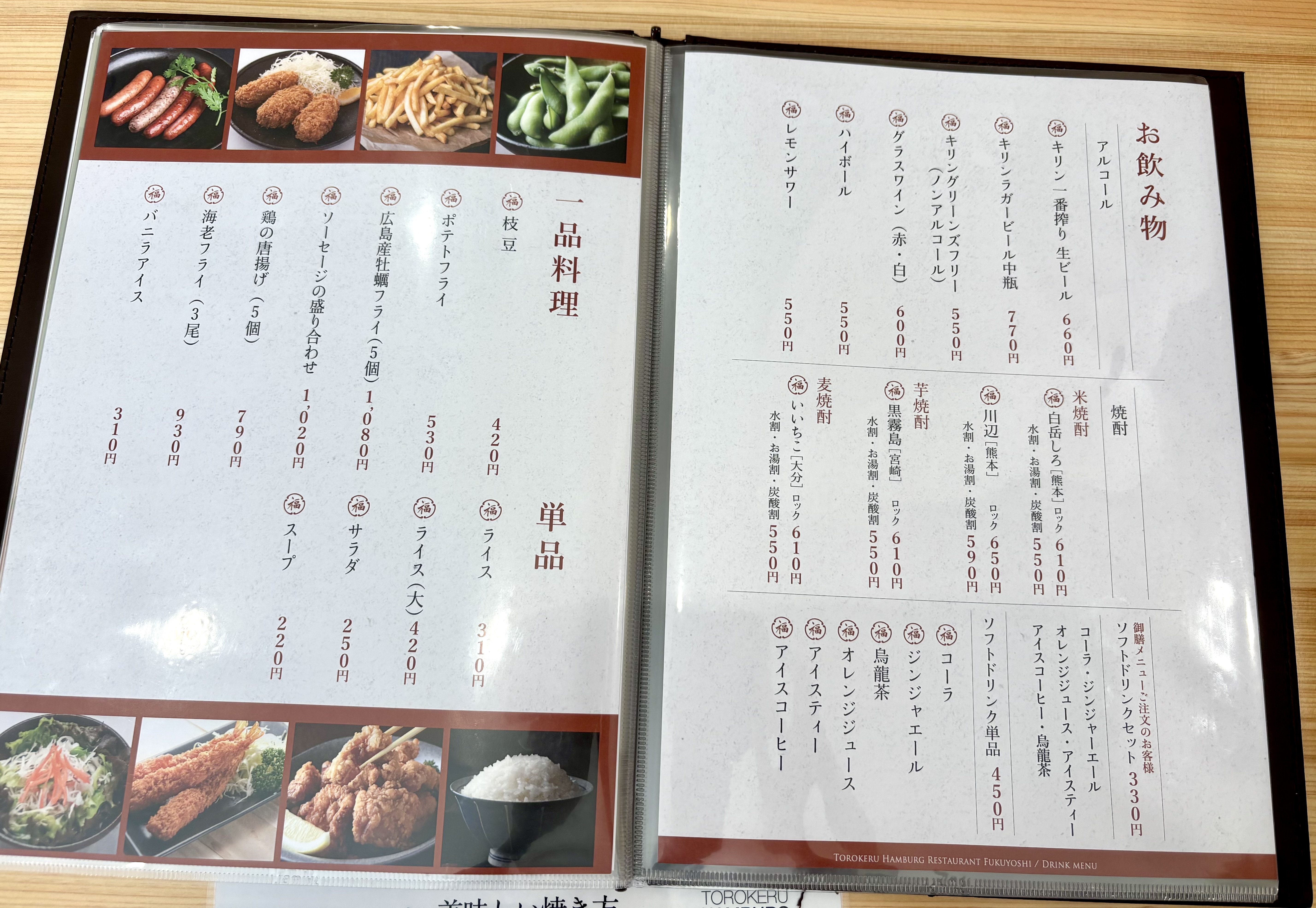 サイドメニューやお酒、ドリンクもあります。