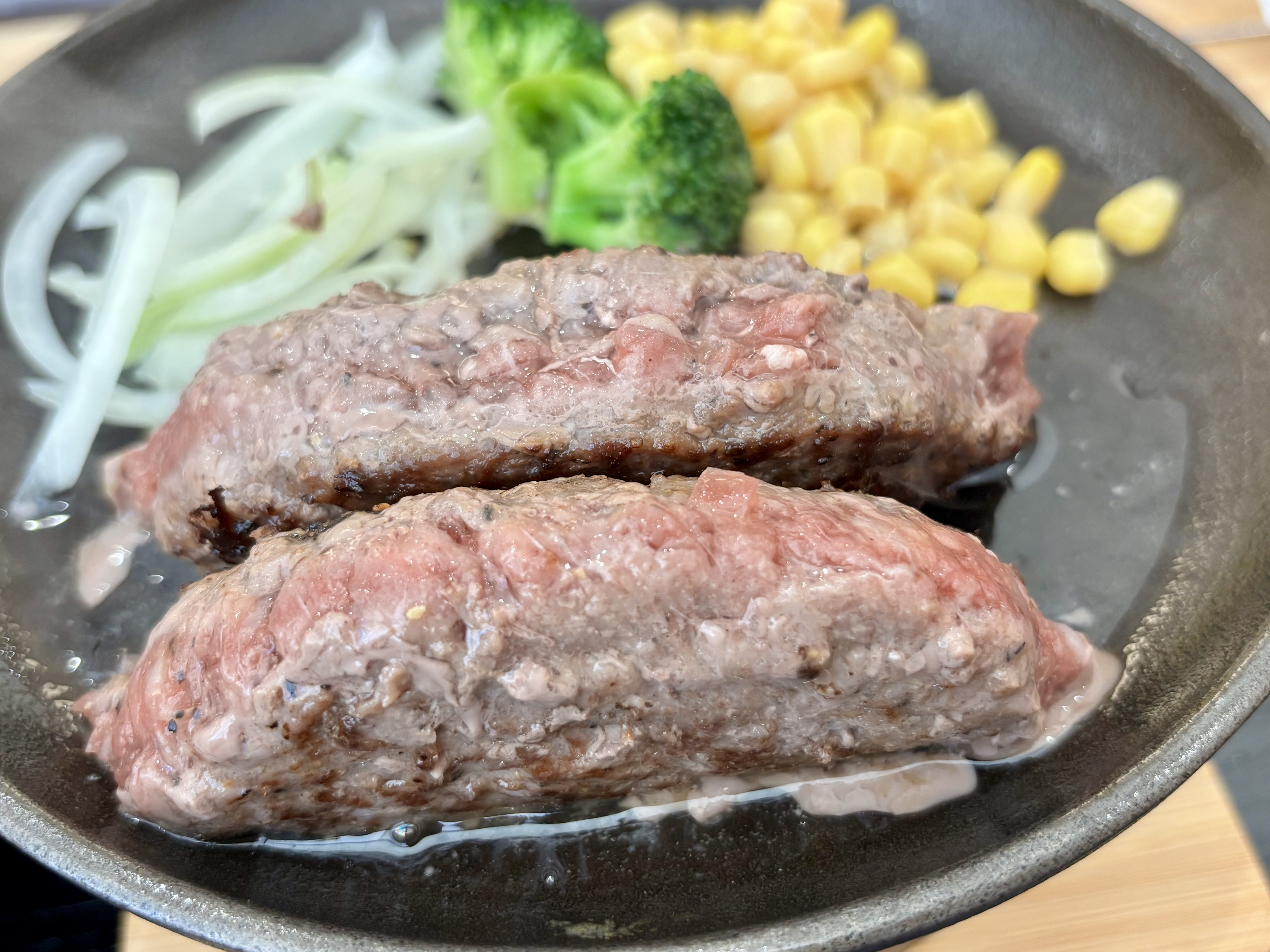 ハンバーグが鉄板に乗って、ジュウジュウ音を立てながらやって来ました。