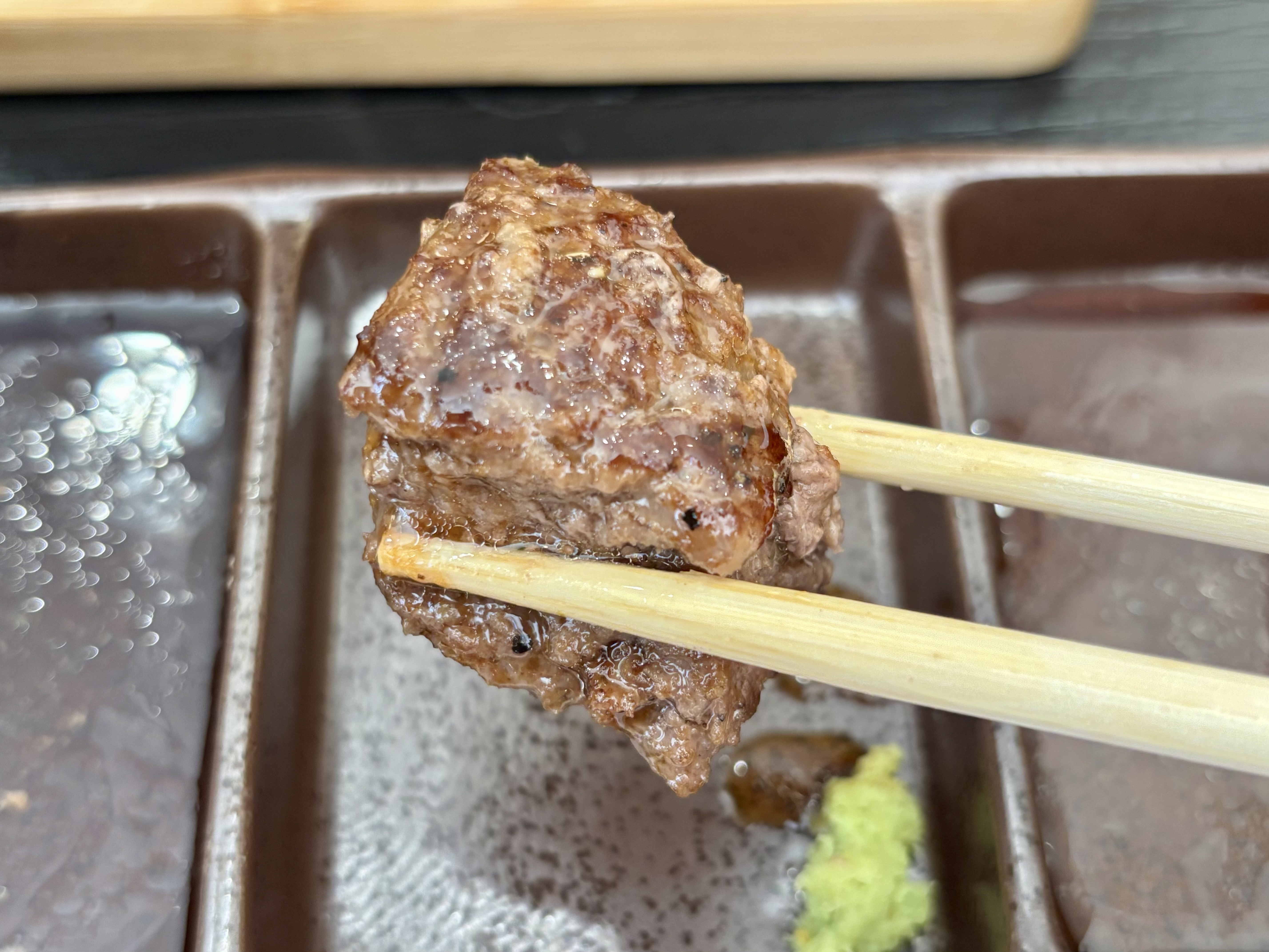 つけダレは、ハンバーグソース、わさび塩、醤油ダレが用意されています。