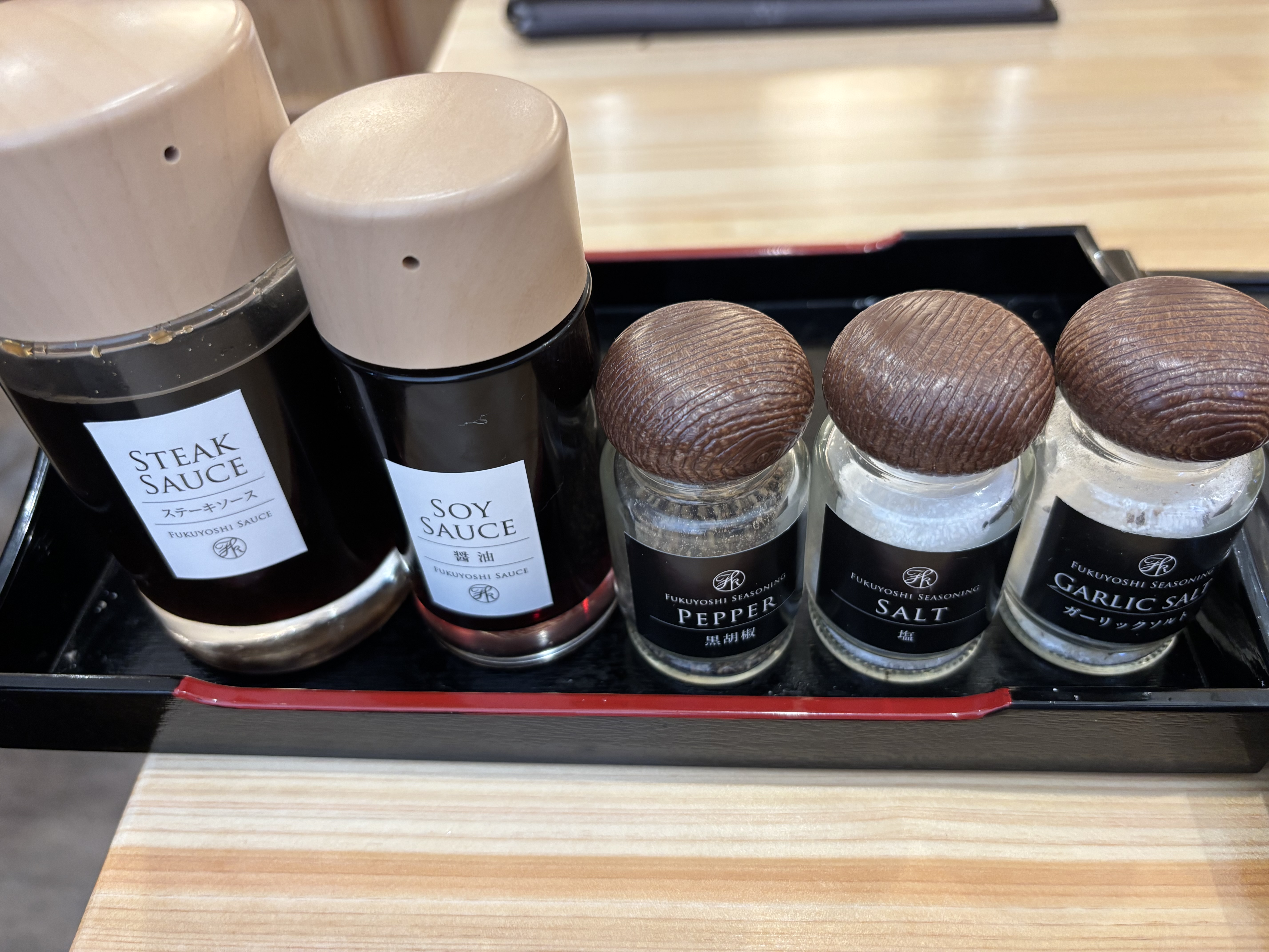ガーリックライスの調味料は、ガーリックソルトはもちろん、こだわりのステーキソースなども用意されています。