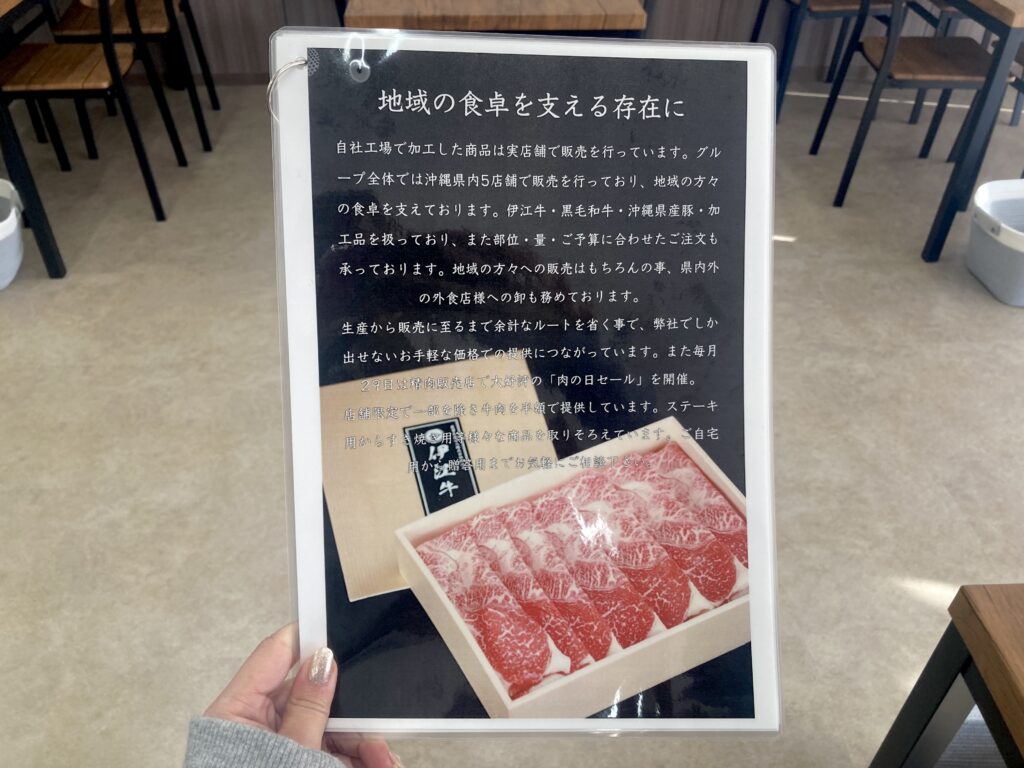 お店の最大の特徴は、沖縄伊江島で育てられた希少なブランド和牛「伊江牛」を使った料理が味わえる点。