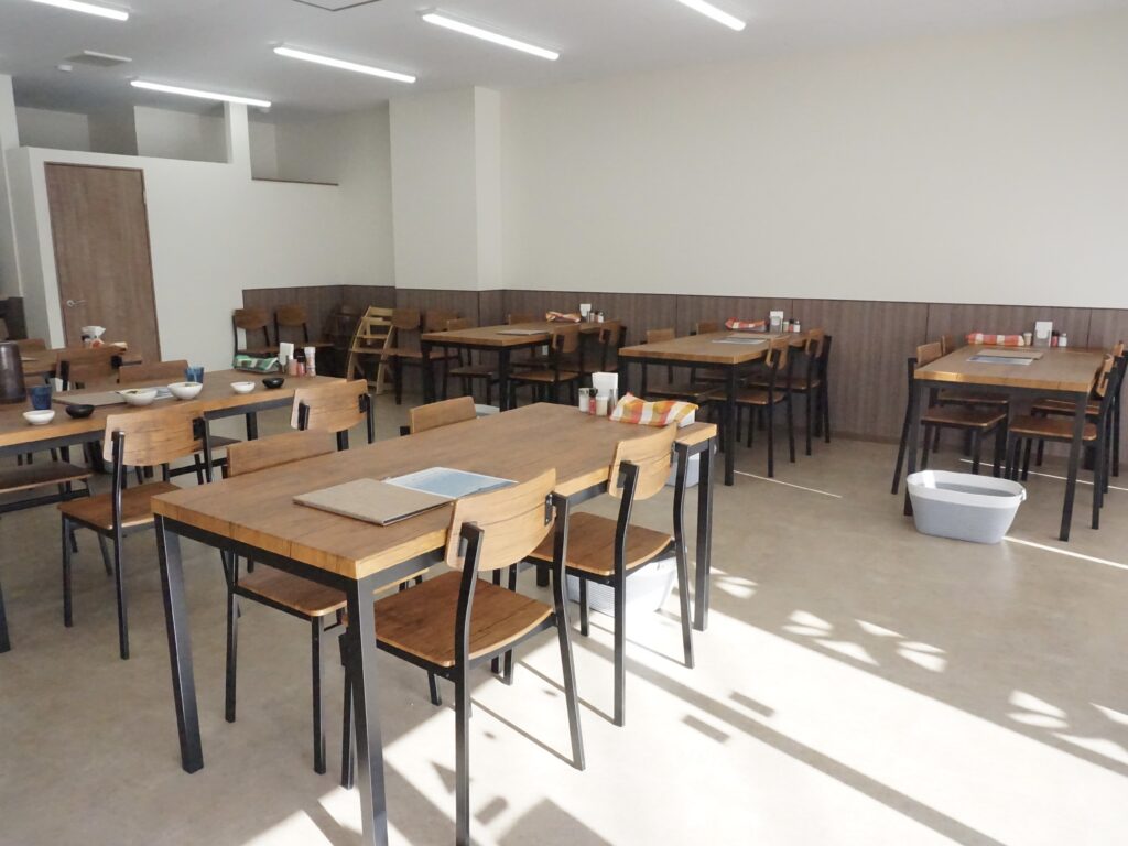 店内は木製のテーブルや椅子が並ぶ、シンプルで落ち着いた雰囲気。