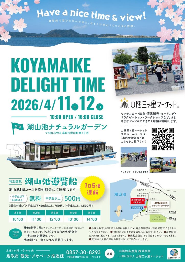 心ときめく春のひとときを楽しむイベントです。会場には「山陰三ッ星マーケット」の人気キッチンカーやショップが集結し、絶品グルメや癒やしのワークショップが勢ぞろい。さらに、この2日間は湖山池遊覧船が特別料金で運航され、湖上からの絶景を気軽に堪能できる絶好の機会となっています。
