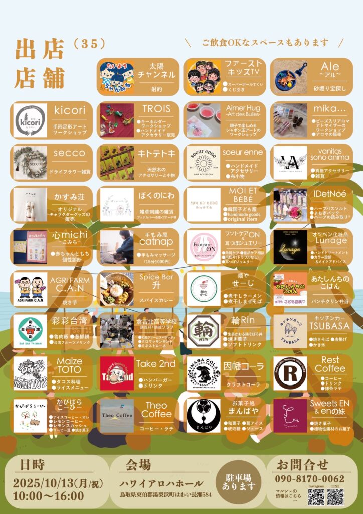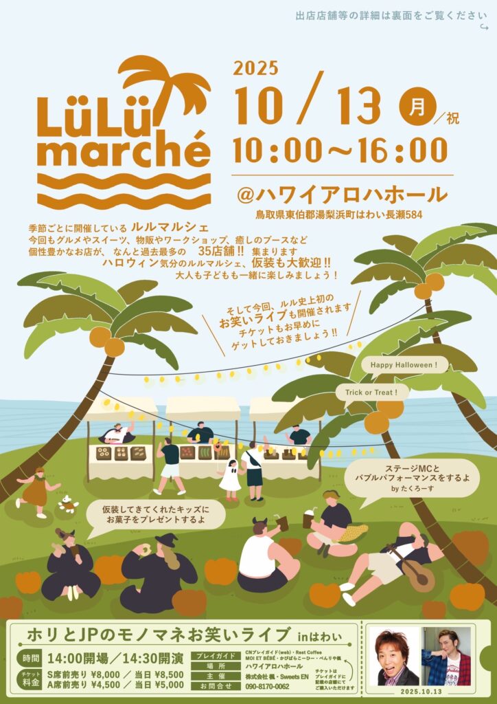 LüLü marché(ルルマルシェ)は、季節ごとに開催される人気イベントで、湯梨浜町を中心に個性豊かなお店が集まる大規模なマルシェです。