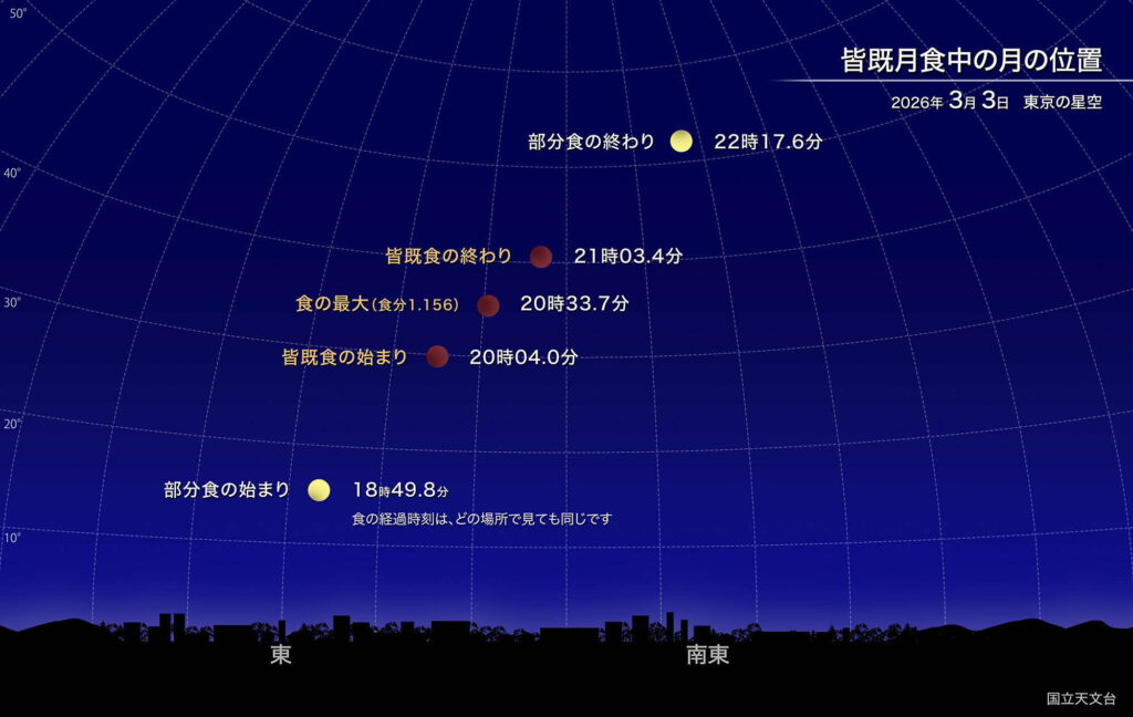 ー2026年3月3日の月食は、何時頃、どの方角を見上げたらよいのでしょうか。