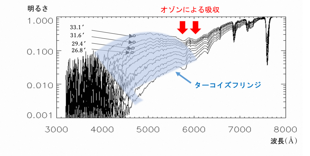 オゾンは赤い色の光を吸収するため、オゾン層を通過した太陽光は赤色の成分を失い青色となり、その光が地球の影に侵入することで月面を照らし、ターコイズフリンジが生じるのです。