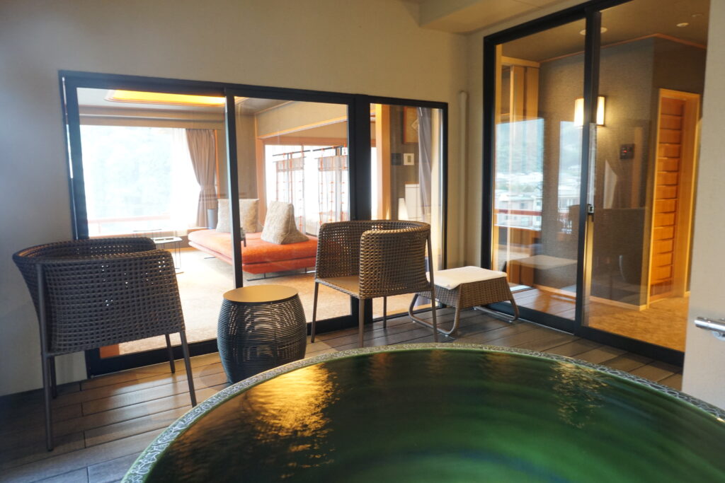 三朝スイートの大きな魅力のひとつが、露天風呂付き客室であること。