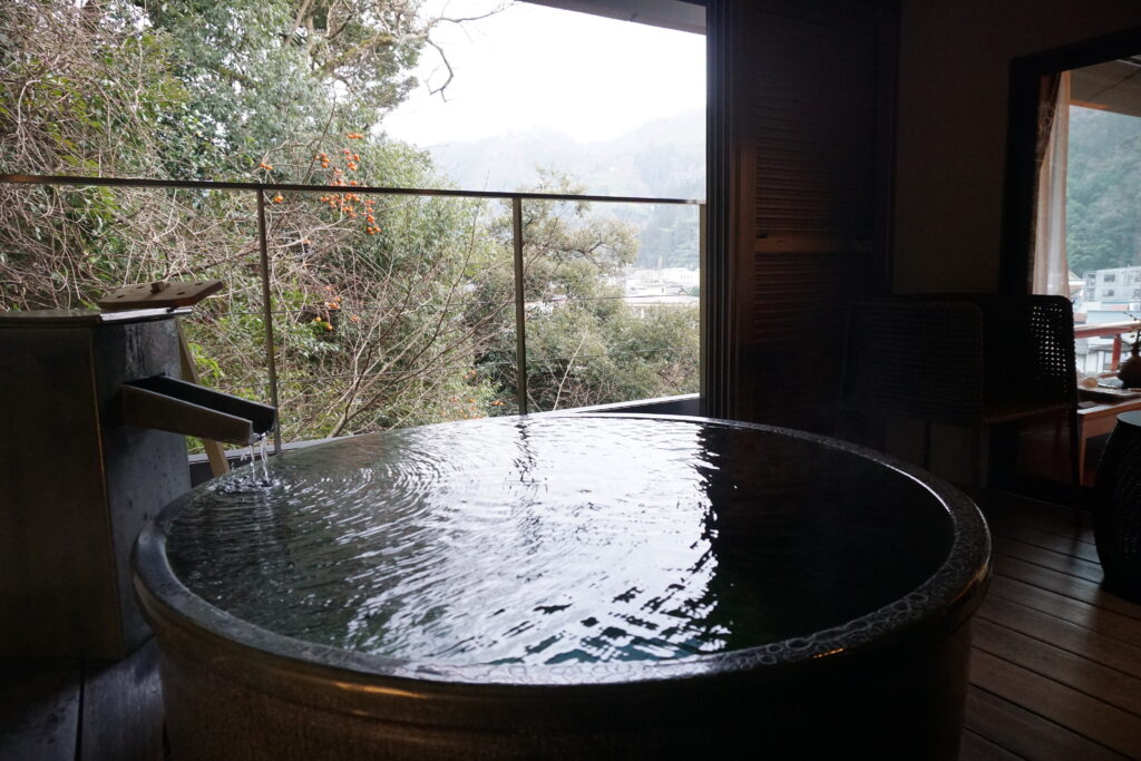 デッキテラスに設えた専用露天風呂では、源泉100%のかけ流し温泉(加温・加水あり)を、個室客室ならではのプライベートな空間で24時間楽しむことができます。