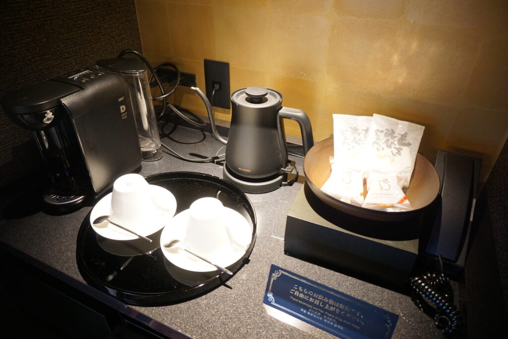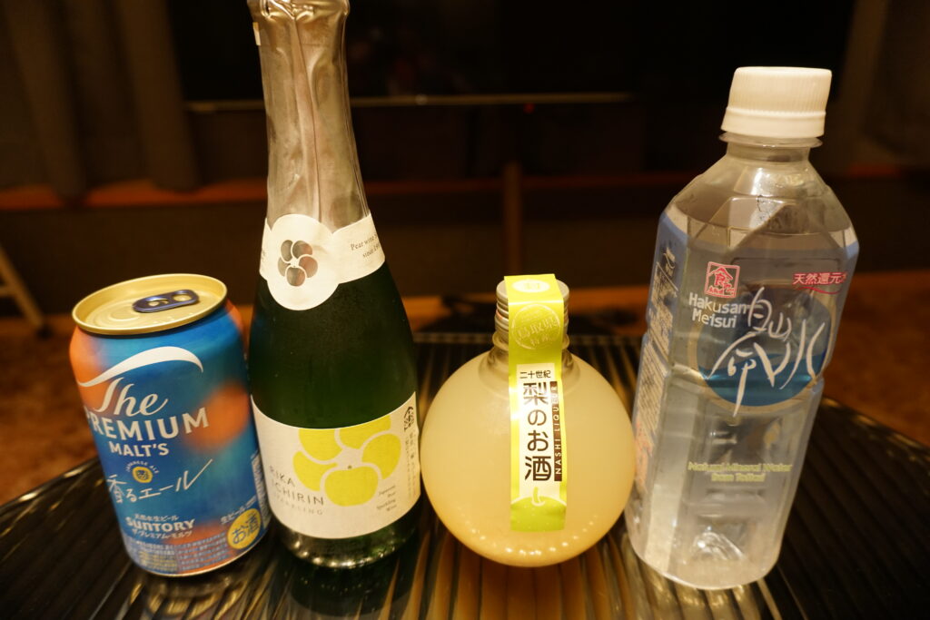 スイートルームには、コーヒーをはじめ、地酒の二十世紀梨のお酒、スパークリングワイン、ビール、ミネラルウォーターなど、インクルーシブドリンクが用意されています。
