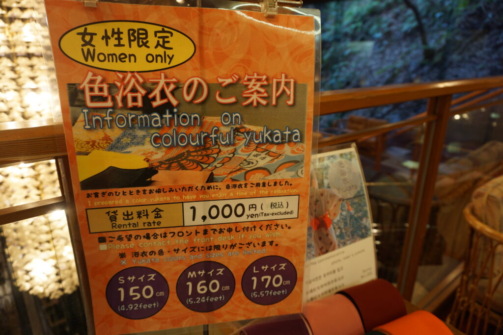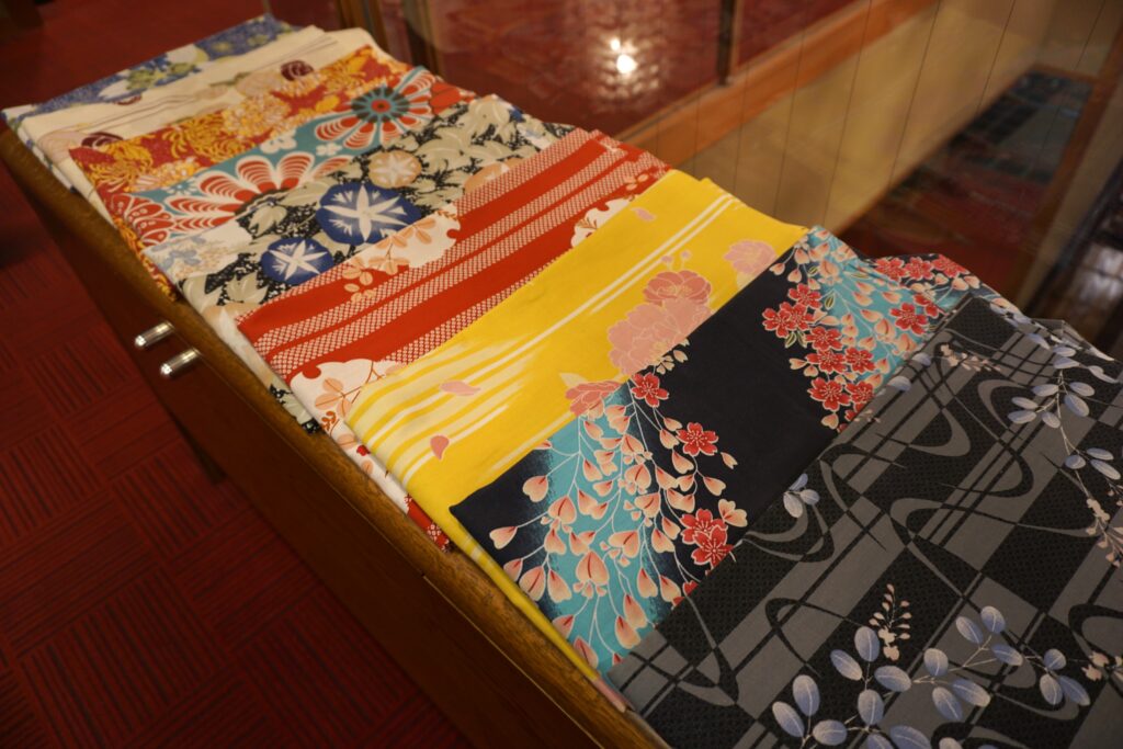 客室に浴衣が用意されていますが、他にも色柄豊富な色浴衣がレンタル可能です。
