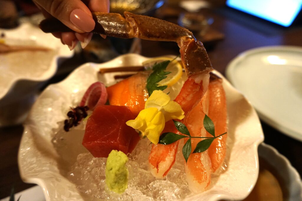蟹刺しは、氷の上で身がふっくらと開き、花が咲いたような美しい姿に。