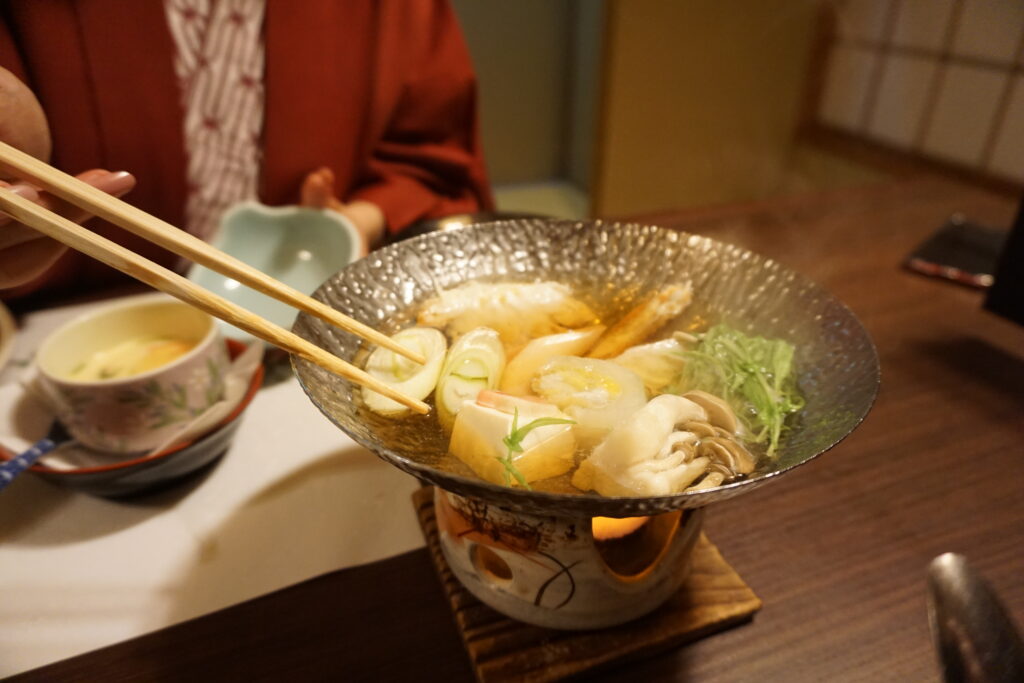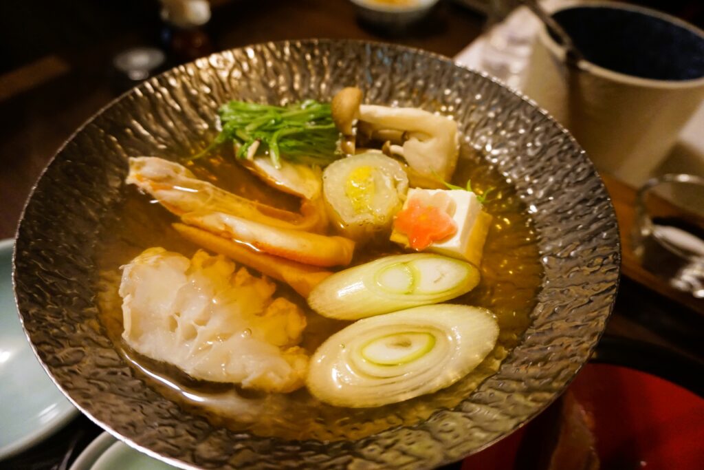 温かく澄んだ出汁に蟹の身をくぐらせます。