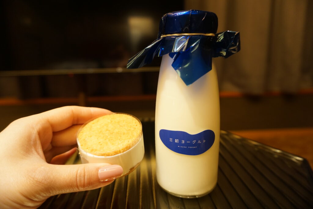 万翆楼から徒歩圏内にある、ヨーグルト専門店三朝ヨーグルトで販売されている「飲むヨーグルト」、鳥取県産米粉を使用した「ヨーグルトバターサンドクッキー」。