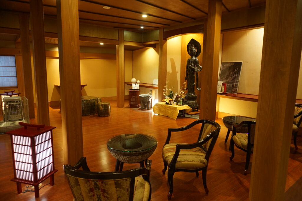 湯上り処で静かに佇むお薬師様は、旧木造棟の建設と温泉掘削の工事中に出土したもの。