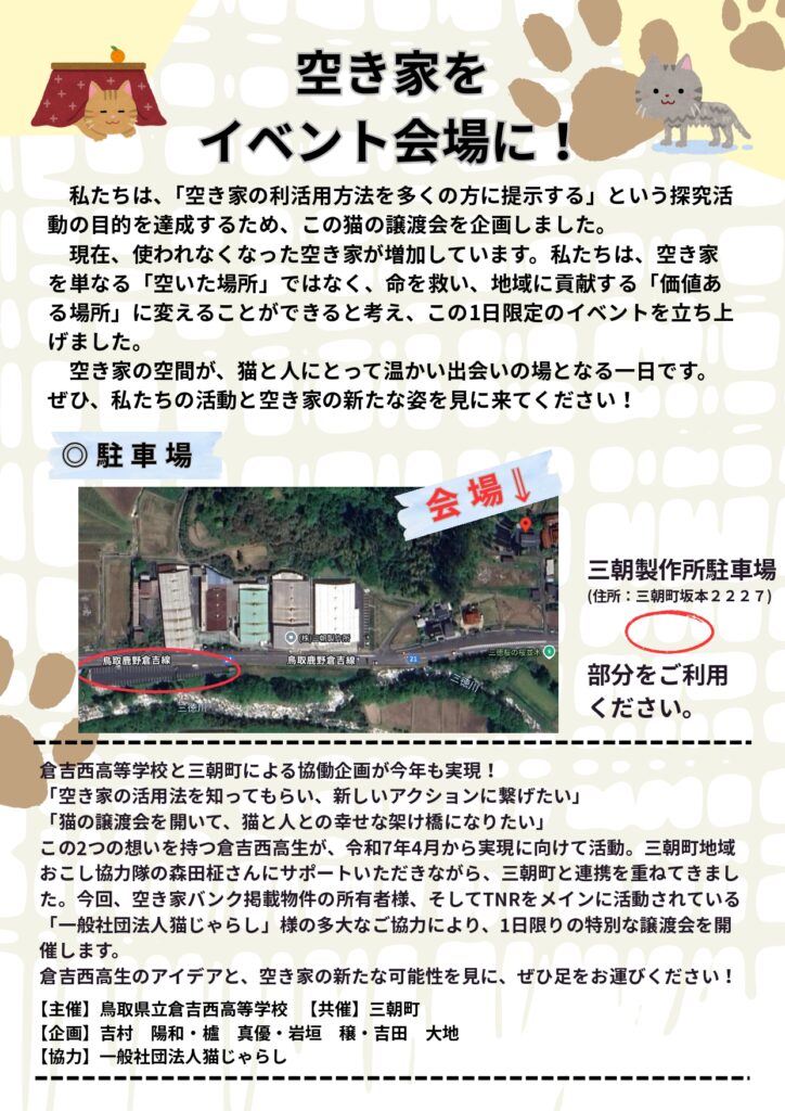 2025年11月30日(日)、三朝町にある一軒の空き家で、ほっと心があたたまるイベント「保護猫譲渡会」が開催されます。