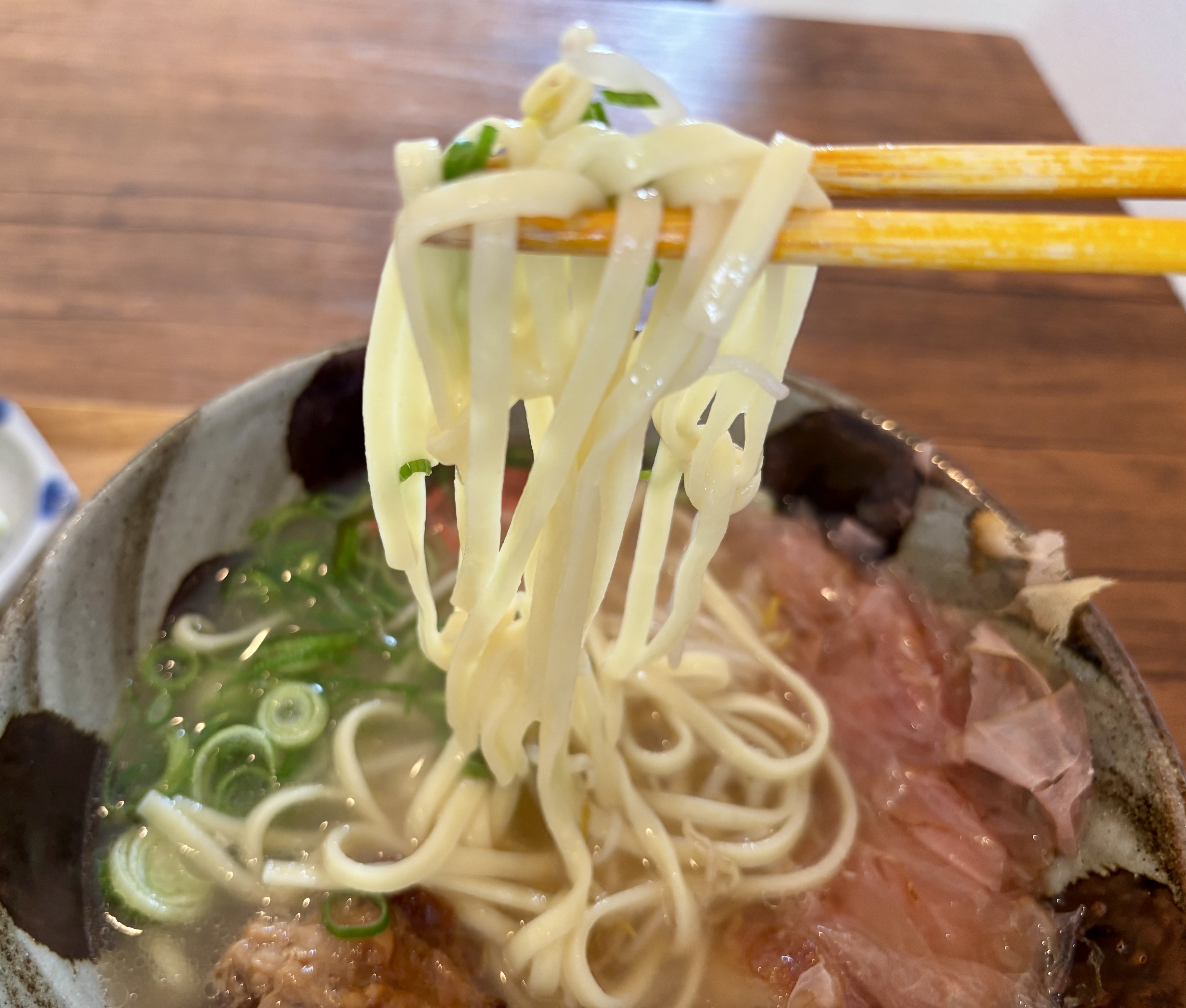 スープは、あっさりとした鰹の旨味にとんこつのコクが加わって絶妙。