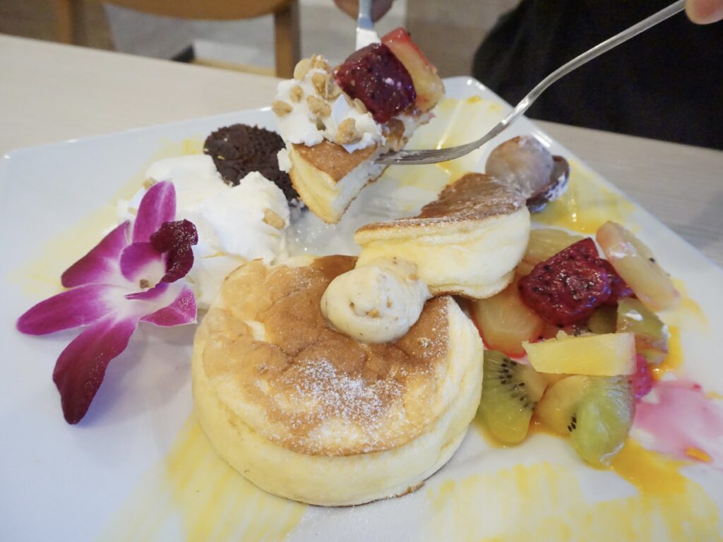 時間が経ってもしっかり厚みが残るパンケーキ作りは、まさに職人技です。