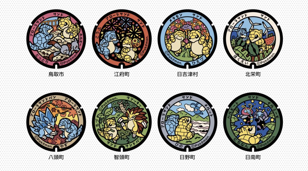 鳥取県内には、「サンド」と「アローラサンド」がデザインされたマンホール「ポケふた」が全20種類設置されています。