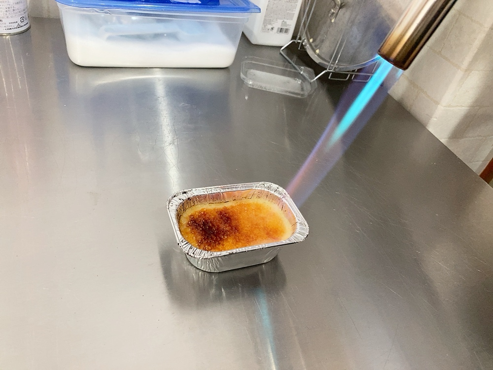 注文後にバーナーを使用しキャラメリゼされる「極生プリン クレームブリュレ」。