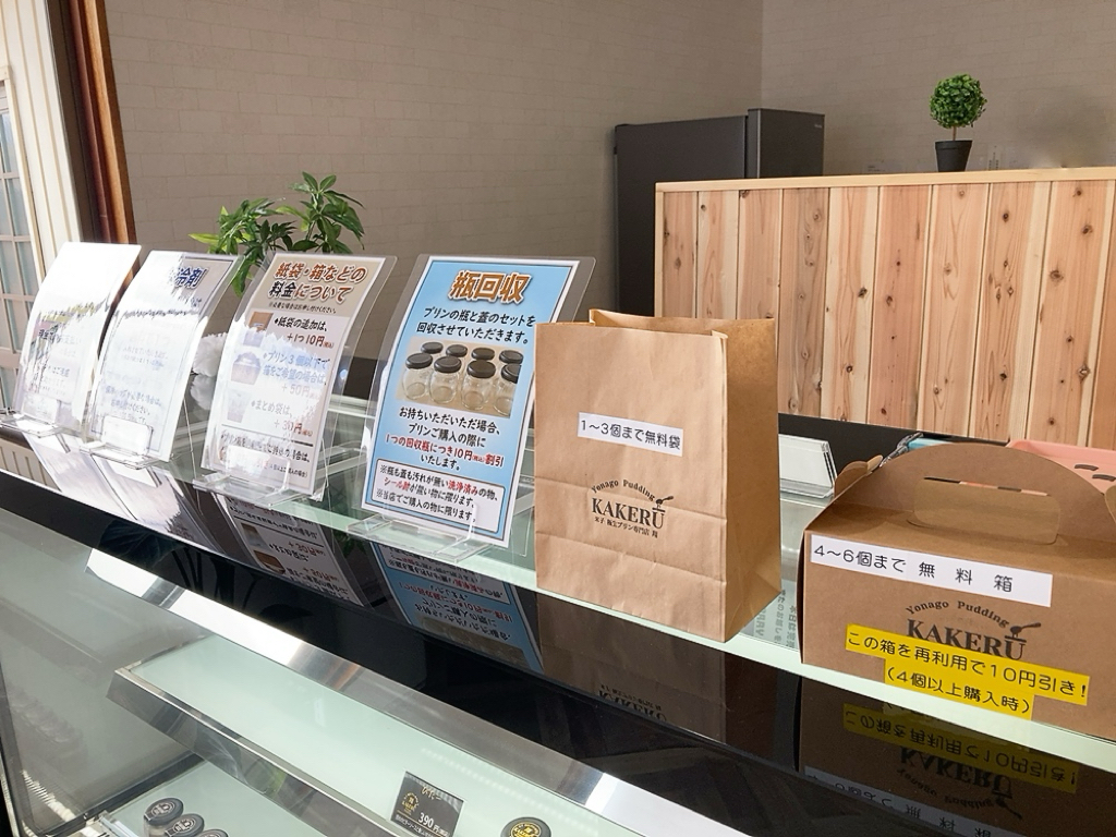 汚れが無く、洗浄済みでシール跡のないプリンの瓶と蓋をセットで持って行くと、10円割引きサービスもあります。