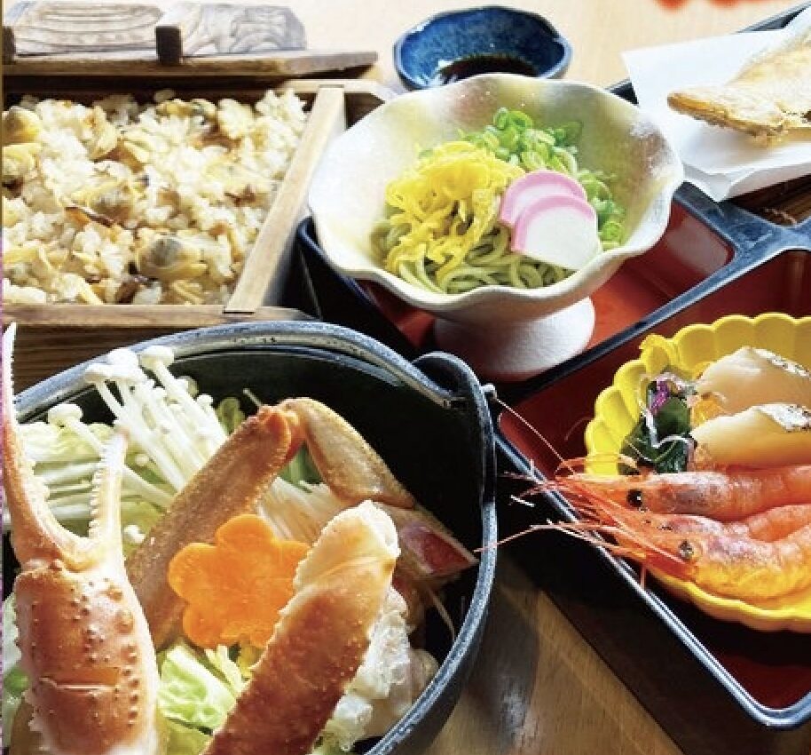 カニ鍋やわかめ蕎麦、あさりのせいろ飯など、鳥取の海の幸をふんだんに使った料理がずらり。秋の砂丘散策のあとは、贅沢なグルメでお腹も心も満たされます。