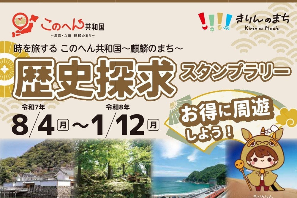 鳥取東部と兵庫北部にまたがる「麒麟のまち」を舞台に、歴史をテーマに巡るスタンプラリーは計7エリアで、城跡や史跡など“時を旅する”ような体験が楽しめます。