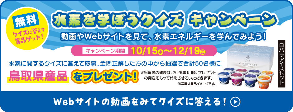 水素に関するクイズに答えて応募、全問正解者の中から抽選で合計50名様に鳥取県産品をプレゼントします。