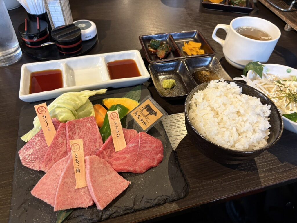 鳥取和牛の「カイノミ」「とも三角」「シンシン」の3種、かぼちゃやピーマンなどの野菜、白ご飯、漬物、わかめが入ったスープ、大根のサラダがあり、ボリューム満点でした。