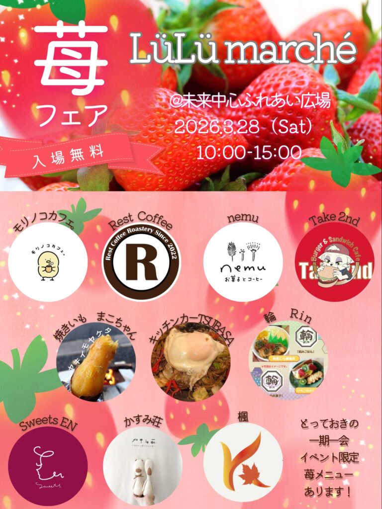 イベント限定の苺メニュー、たくろーすさんのバブルパフォーマンス、フリーマーケットも行われます。