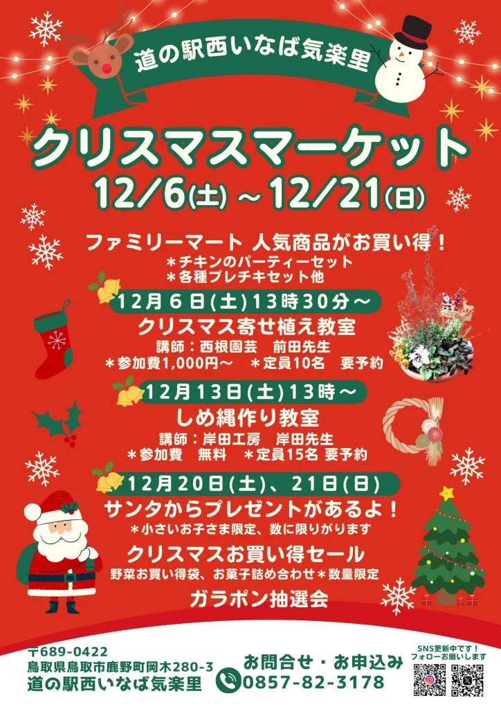 道の駅西いなば気楽里で、クリスマスマーケットが開催されます。