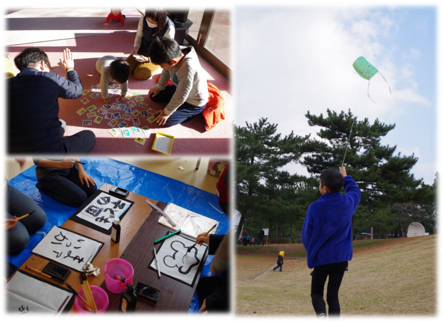 羽子板、書初め、凧あげなど、色々な遊びで楽しめます。