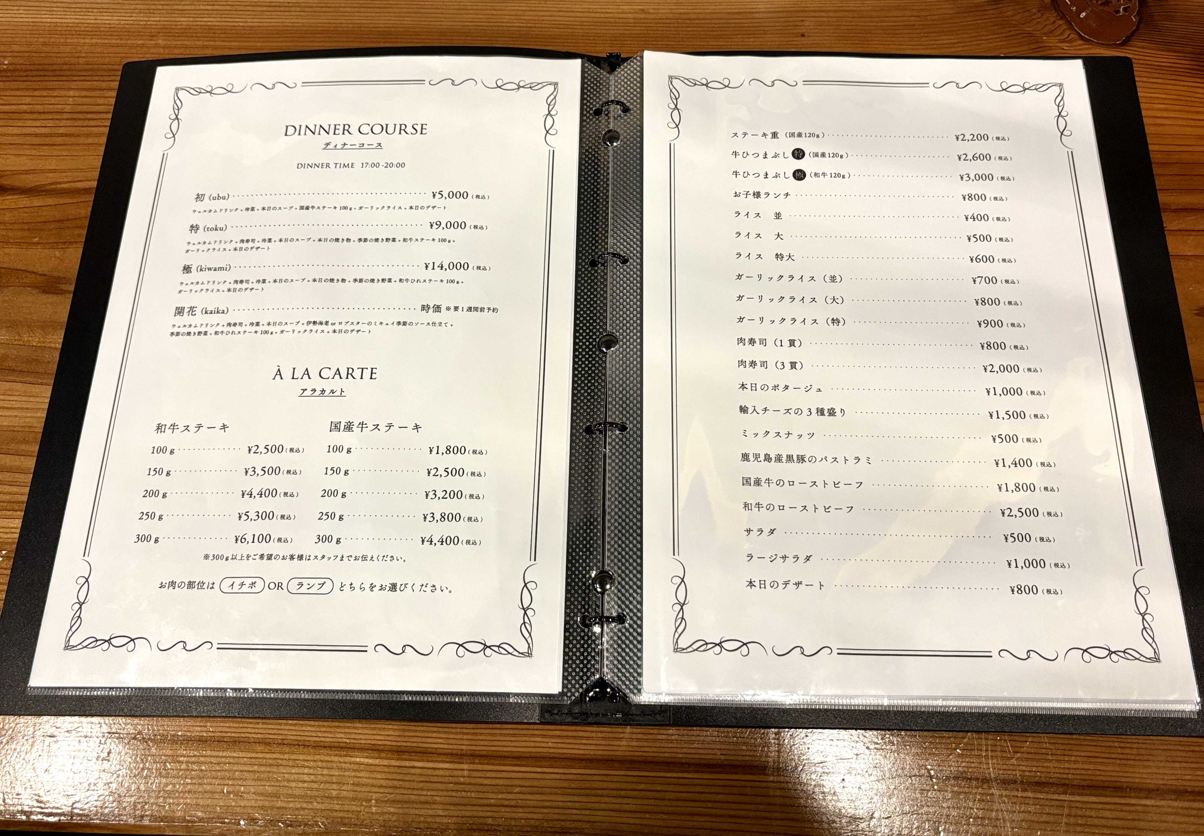ディナーは、コース料理のほかグラムでオーダーできるステーキやサラダ、ポタージュなどの一品料理がオーダーできます。