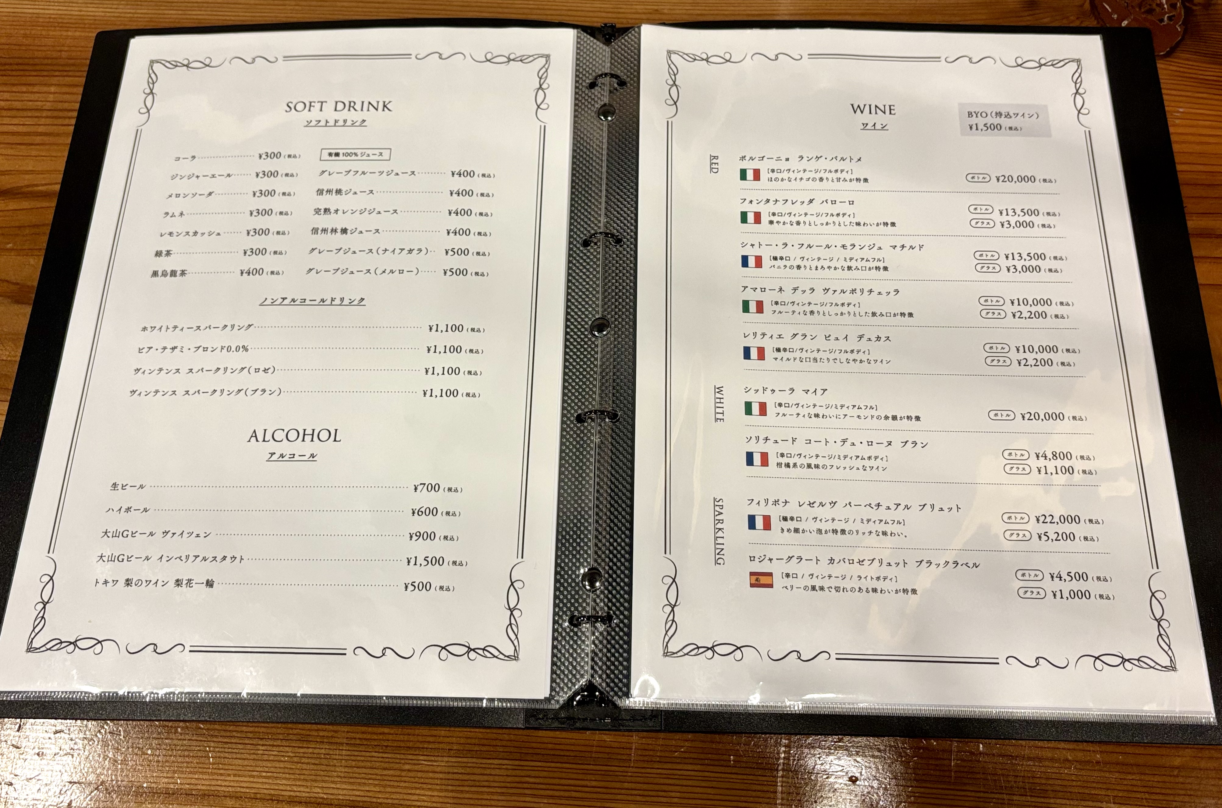 ドリンクは、ジュースやノンアルコールドリンクをはじめ、大山Gビール、フランス産のワインもそろっています。