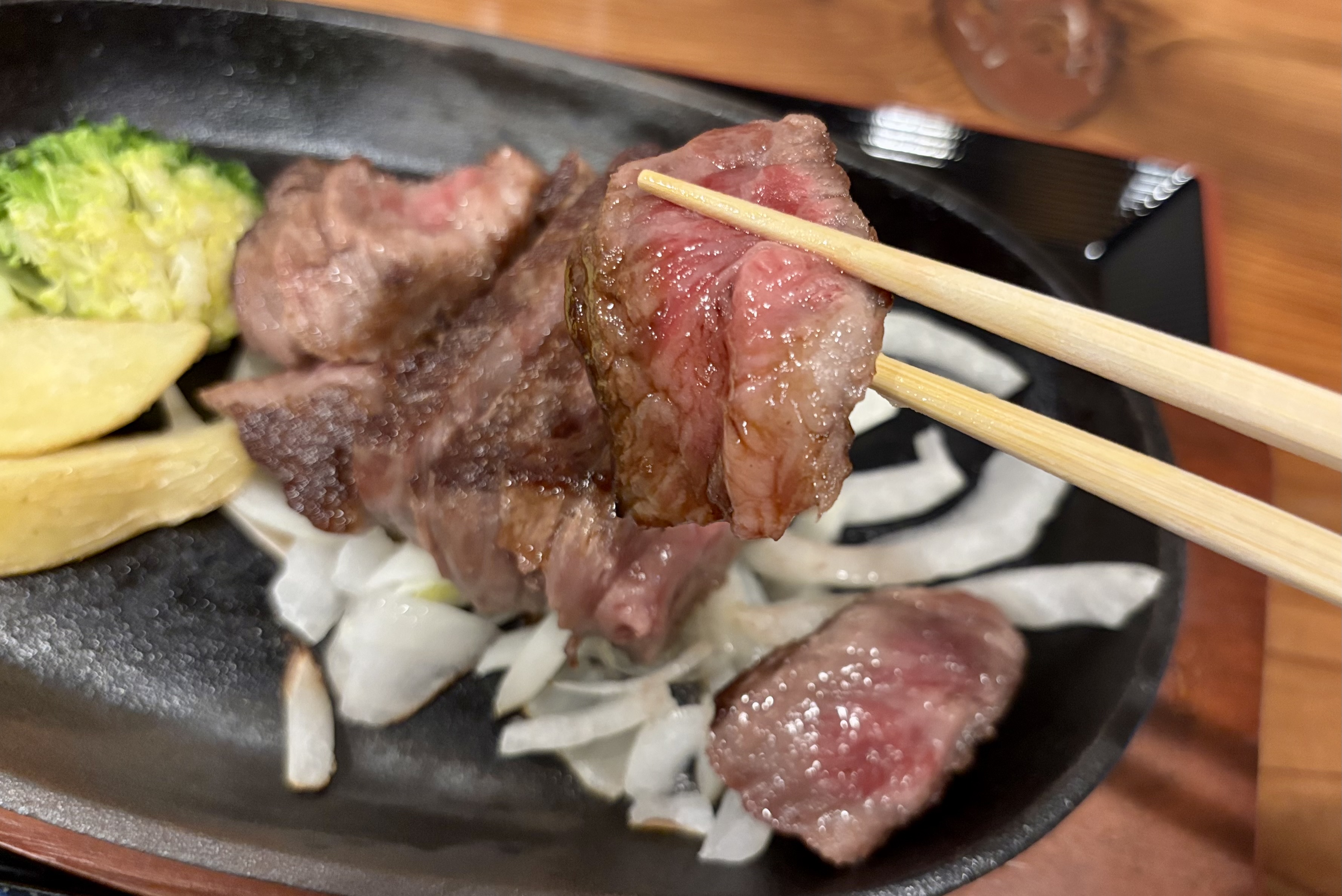 ジュウジュウと音を立てて鉄板に乗ったステーキが運ばれてきました。