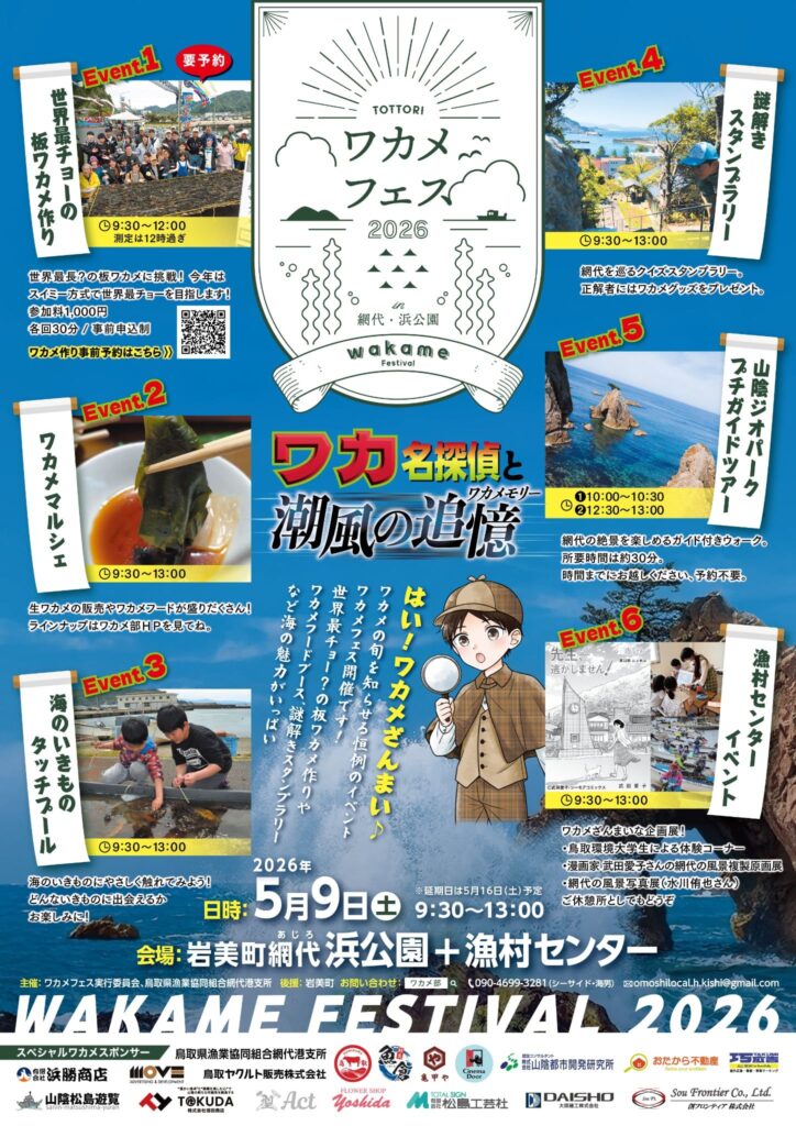 鳥取県岩美町の網代(あじろ)を舞台に、旬のワカメを五感で楽しむ「ワカメフェス2026」が5月9日(土)に開催されます!