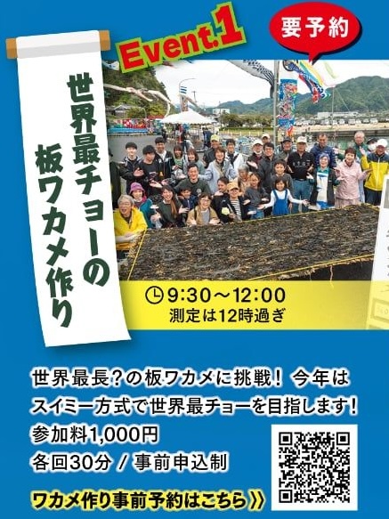 世界最長(最チョー)の板ワカメ作りに挑戦する、本フェスティバルの目玉企画です。各回30分の事前申込制となっており、参加には予約が必要です。世界記録級の長さを目指して、自分だけの板ワカメを作ってみませんか?