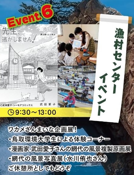 屋内施設の「漁村センター」では、鳥取環境大学生による体験コーナーや、漫画家・武田愛子さんの風景複製原画展、水川侑也さんの風景写真展が開催されます。展示を楽しみながら、休憩所としてもぜひご利用ください。